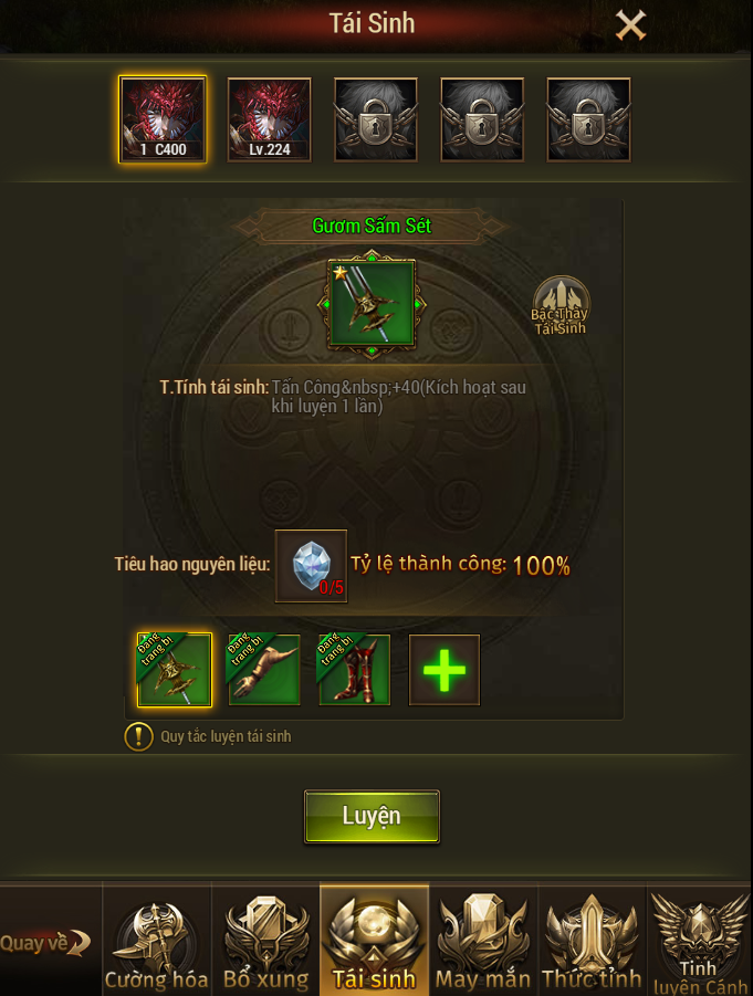 Tẩy luyện thành công thì có thể nhận được buff thuộc tính tương ứng, khi thảy đổi trang bị có thể trực tiếp kế thừa cấp tái sinh